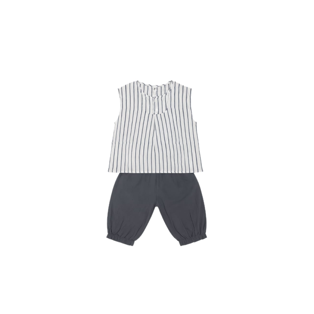 ✨ Design: White sleeveless top with vertical navy stripes & Solid dark trousers with elasticated hem for extra comfort